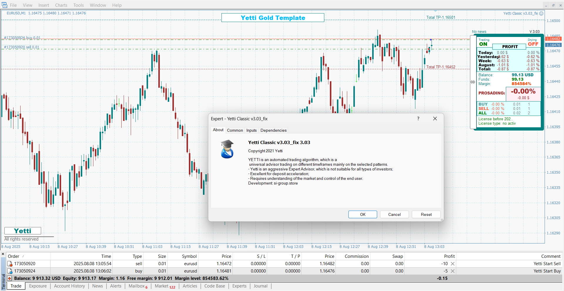 Content: Expert: Yetti Classic v3.03_fix.ex4 (Unlocked-Unlimited), Presets: xag low 200 2022.set, PRO Audi( audusd) Hard 200$.set, EuroCrisis.set, Epicset on USDSGD for NPBFX.set, Epicset on USDSGD for FF.set, NO MANUAL.