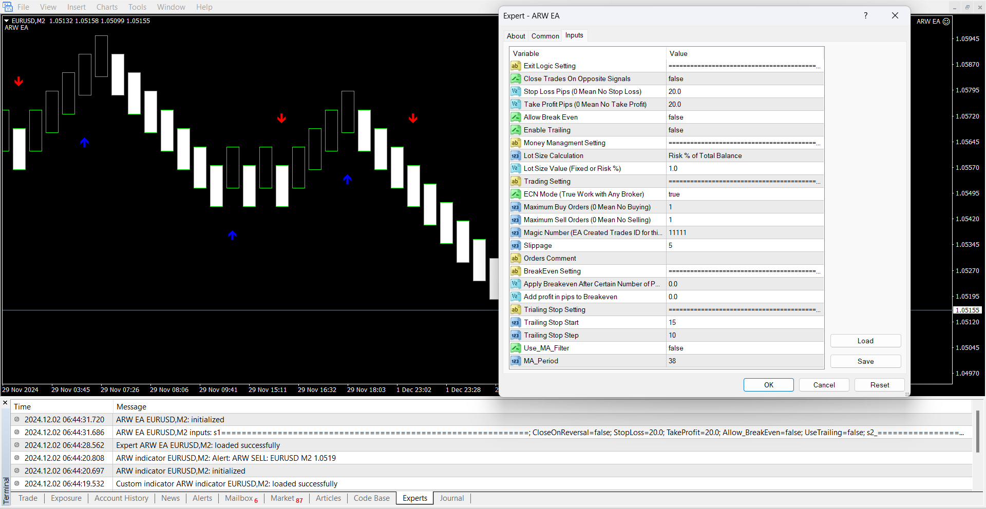 Please note the EA can be used on standard time-based charts too. If you want to use the ARW indicator on standard charts, simply add it to the chart you want to trade and then add the EA to the chart.