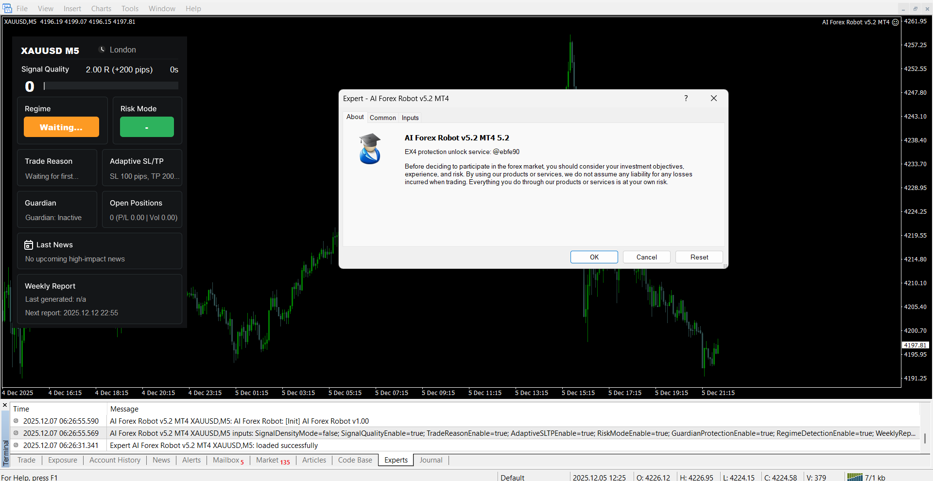 Content: Expert: AI Forex Robot v5.2 MT4.ex4 (Unlocked-Unlimited), Preset: GOLD M5 Preset.set, NO MANUAL.