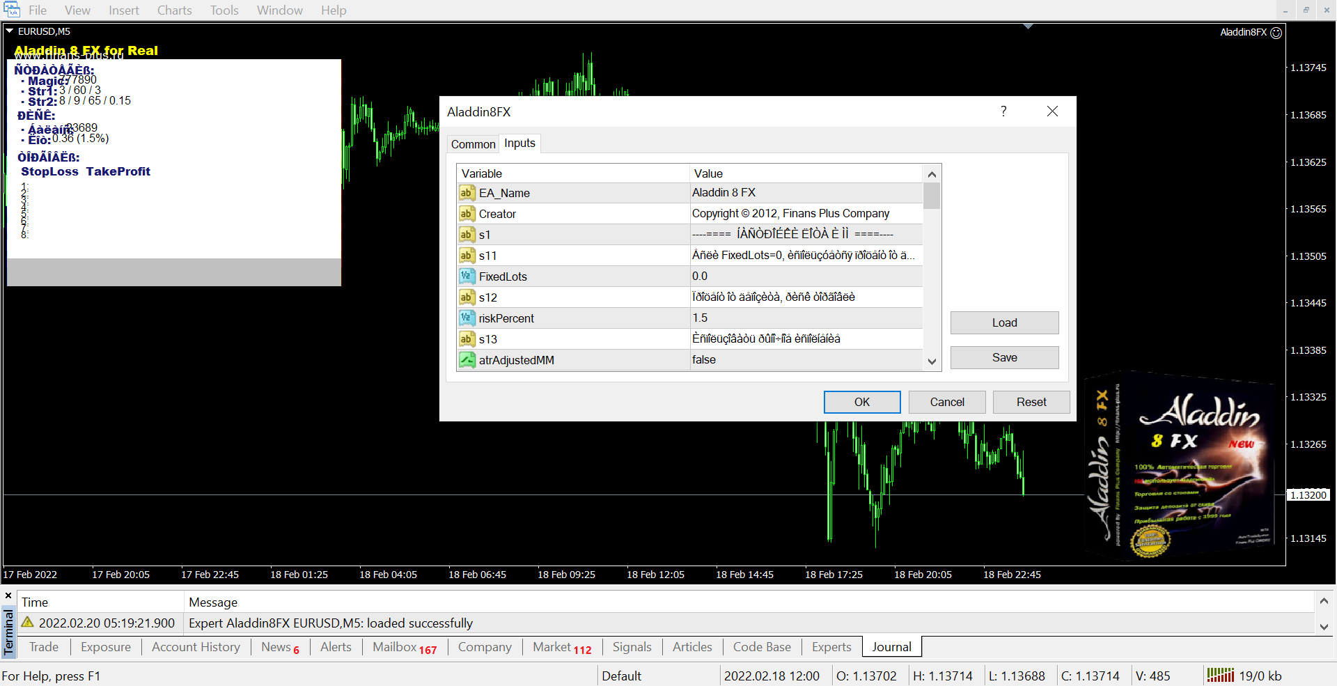 Content: Expert: Aladdin8FX.mq4 (Unlocked–Source Code), Presets: 112012_conservative.set, 112012_normal.set, 112012_agressive_hight_profit.set, NO MANUAL.