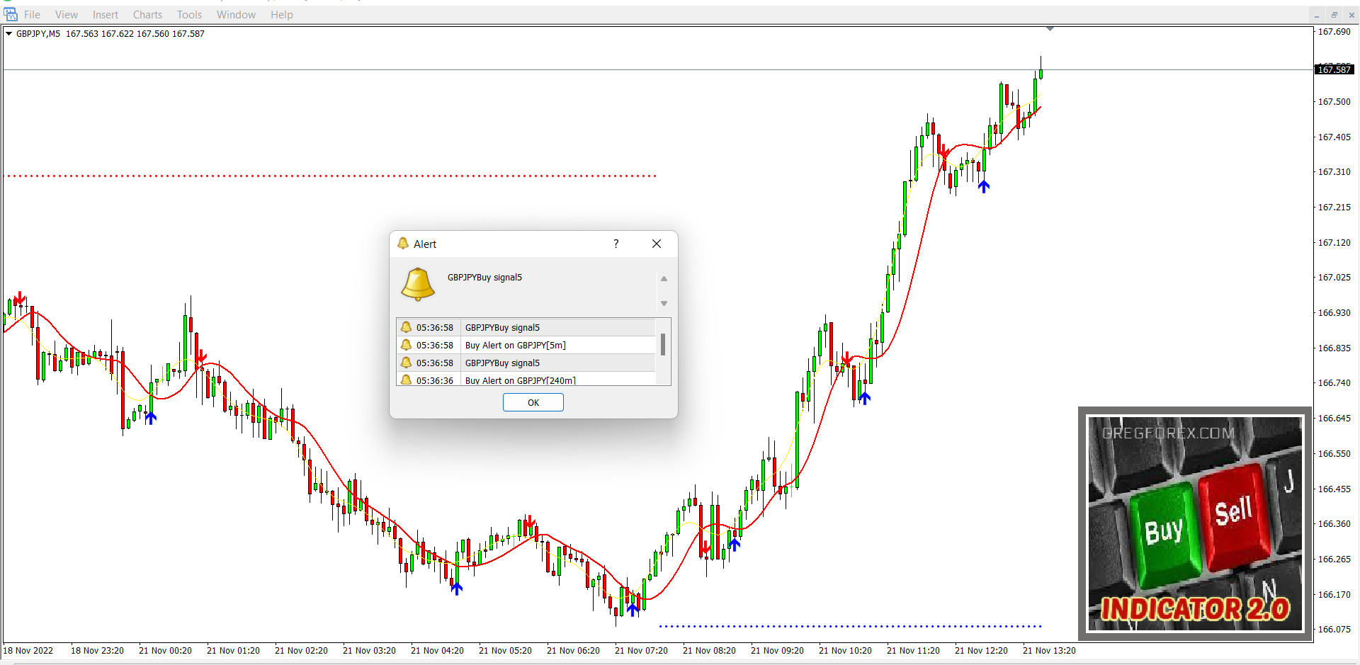 High lights support and resistance levels and signal arrows when to buy and sell.