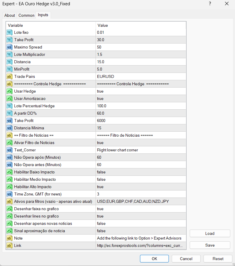 Content: Expert: EA Ouro Hedge v3.0_Fixed.mq4 (Unlocked-Source Code), Libraries: FxsinaisLib.ex4, Preset: Ouro Hedge EURUSD Default.set, NO MANUAL.
