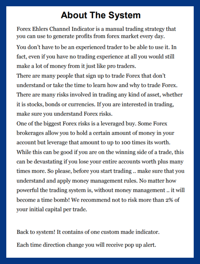 Content: Indicator: Forex Ehlers Channel Indicator.mq4 (Unlocked-Source Code), Template: Ehlers Channel Template.tpl, UserGuide: Forex Ehlers Channel Indicator.pdf.