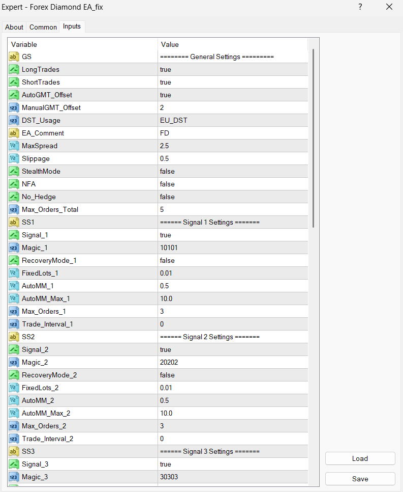 - DST_Usage – This parameter is one of the most important parameters because it tells to Forex Diamond EA how to deal with the GMT offset. You can set 3 different values on this parameter. Actually, it is a drop-down list and you only need to choose the correct value for your broker.