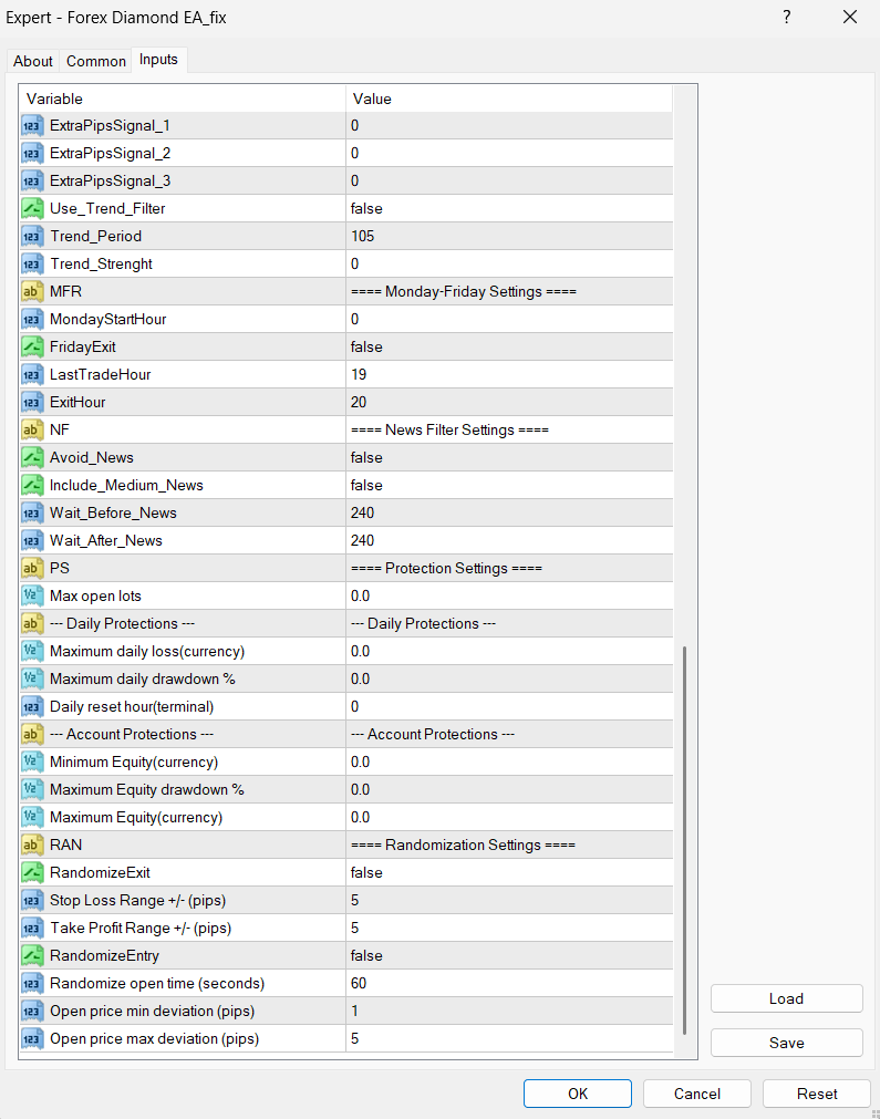 - EA_Comment – enter comments here if you’d like to record comments about your Forex Diamond trades.