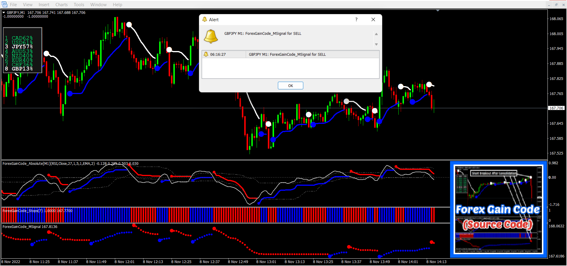 Content: Indicators: ForexGainCode_Absolute.mq4, ForexGainCode_Meter.mq4, ForexGainCode_MSignal.mq4, ForexGainCode_SLine.mq4, ForexGainCode_Stops.mq4 (Unlocked-Source Code), Template: fgc_template.tpl, UserGuide: Forex Gain Code Manual.pdf.