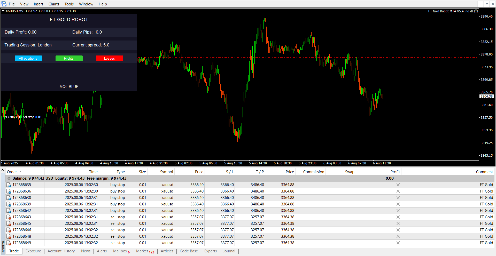 FT Gold Robot scans the gold market in real-time, analyzing patterns, trends, and price movements on the M5 timeframe. The robot opens up to 5 positions per day (fully adjustable), every weekday, ensuring consistent engagement with the market.