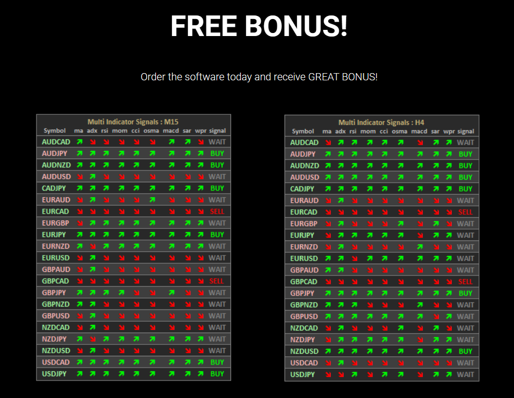 Content: Indicators: 9 (Unlocked-Unlimited), Templates: 4, UserGuide: SONIC WAVE PROpdf.pdf, BONUS INDICATOR: Dash Multi Indicator Signals.ex4.