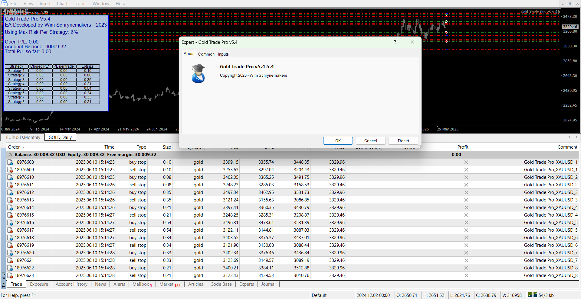 Setup is very easy. Simply open a gold chart on daily timeframe, drag the EA to the chart, and set the lotsize settings.
