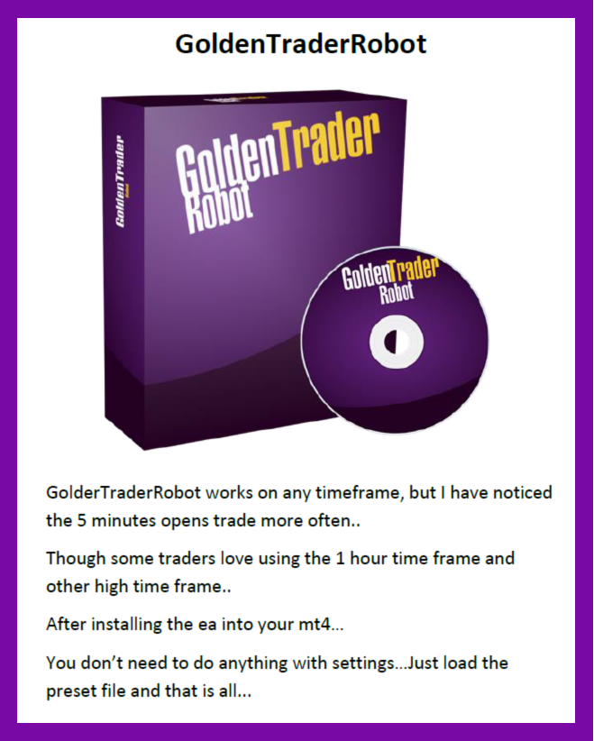 Content: Expert: GoldenTraderRobot.ex4 (Unlocked-Unlimited), Preset: GoldenPresetValue.set, UserGuide: GoldenTraderRobot.pdf.