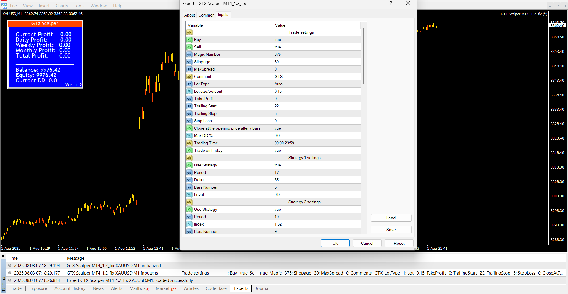 | Order Comment | Label attached to orders placed by the EA | “GTX” |