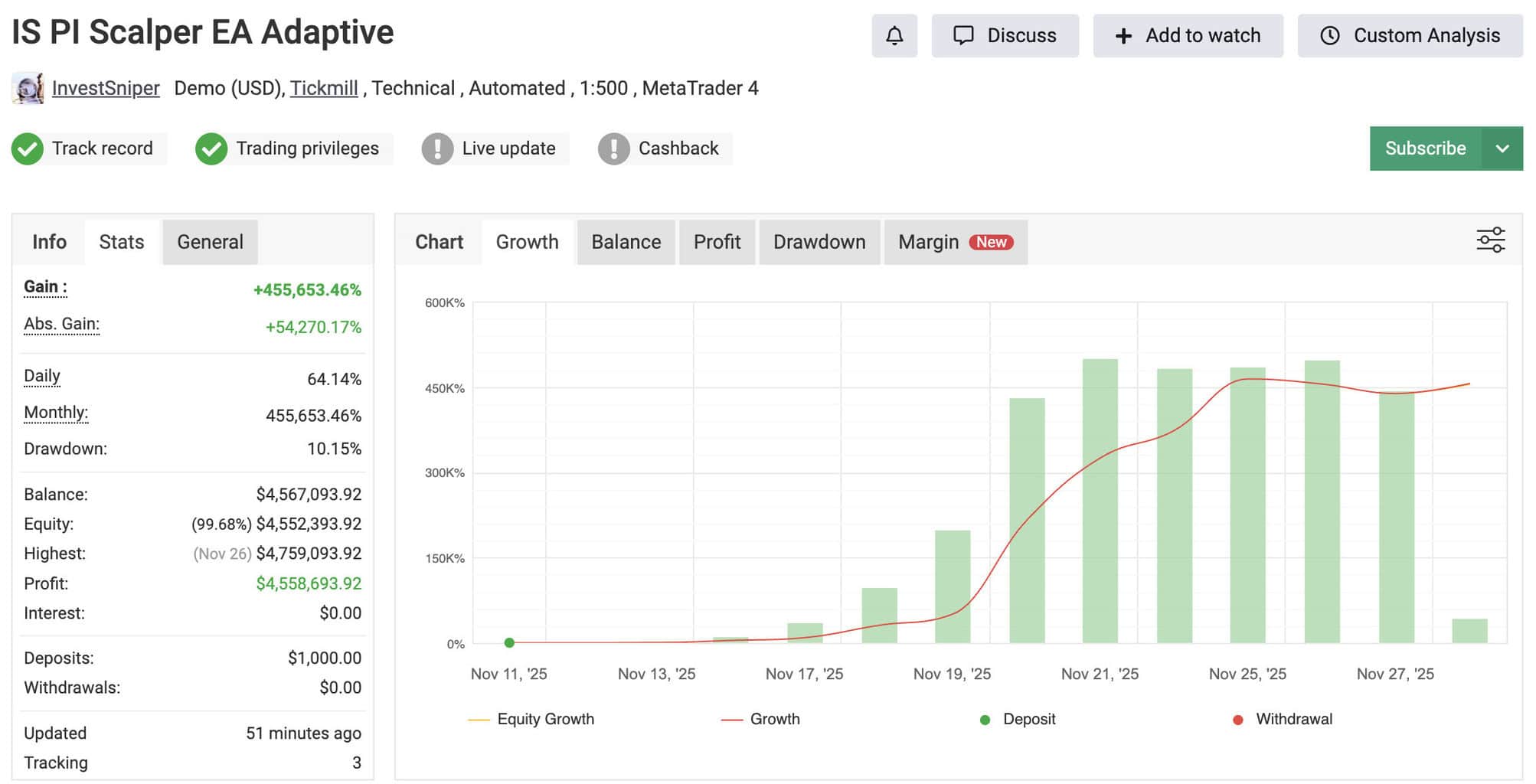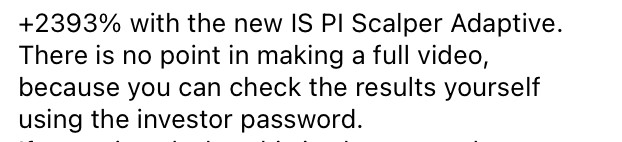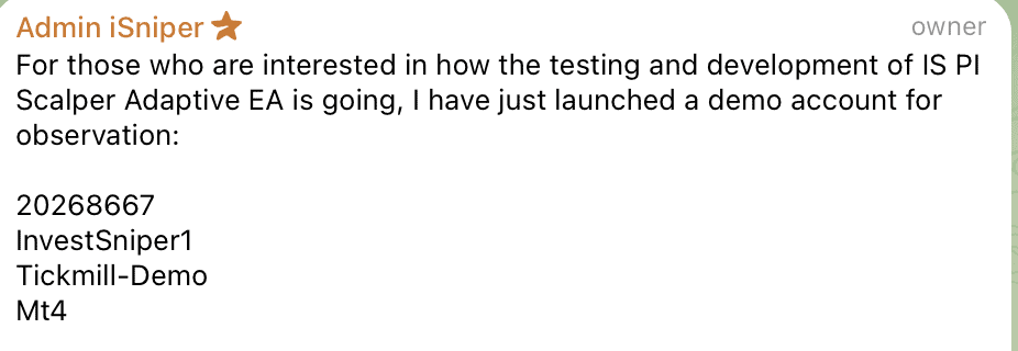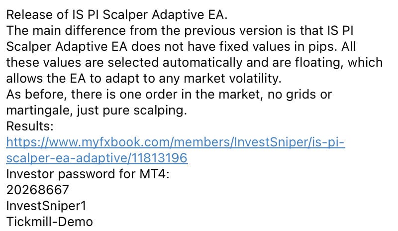 Invest Sniper’s original product description: The Invest Sniper team is now preparing to release a brand-new EA called “IS PI Scalper Adaptive.” Everybody knows that the original IS PI Scalper EA performs exceptionally well. The new Adaptive version builds on this success by dynamically responding to market volatility: increasing its parameters when volatility rises and easing them when the market is calmer. The result is an even smarter, more flexible trading experience.