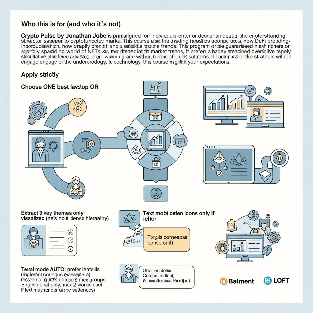 Crypto Pulse by Jonathan Jobe is primarily designed for individuals eager to enter or deepen their understanding of the cryptocurrency market. This course is ideal for beginners who need a structured introduction to complex topics like crypto trading fundamentals, how DeFi protocols work, and the rapidly expanding world of NFTs. It’s also suitable for intermediate investors looking to refine their strategies and stay current with market trends.