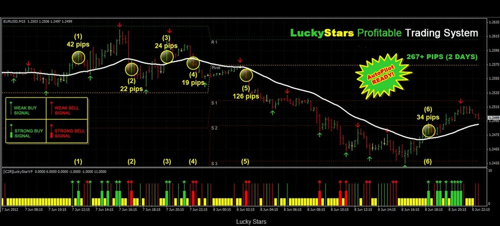The Lucky Stars system provides a clear, structured approach to intraday trading with precise buy/sell signals based on a combination of trend and momentum indicators. By utilizing the Lucky Star VF indicator alongside key moving averages and MACD, this system helps traders identify favorable trading conditions with automatic trade management for added convenience.