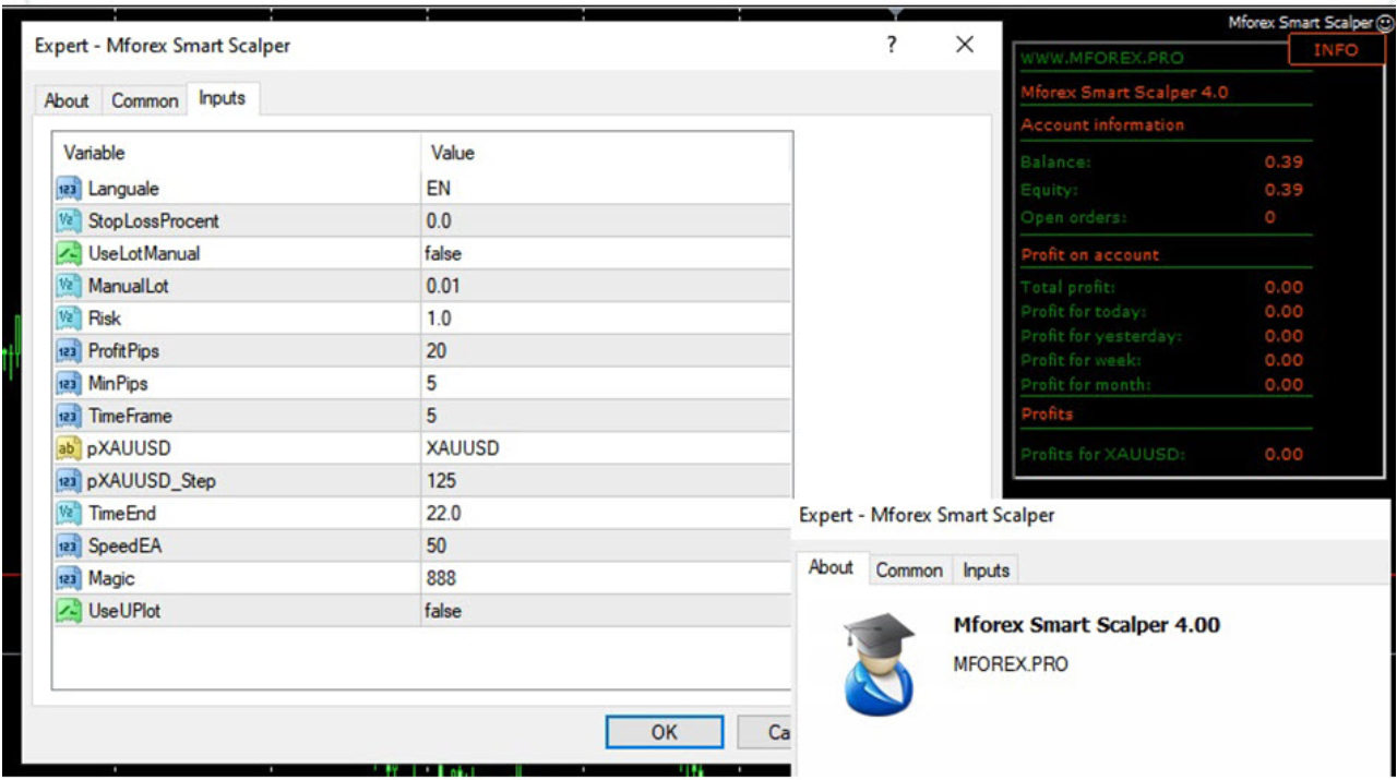 Content: Expert: Mforex Smart Scalper.ex4 V4.0 (Unlocked-Unlimited), Default Settings: XAUUSD M1/M5, NO MANUAL.