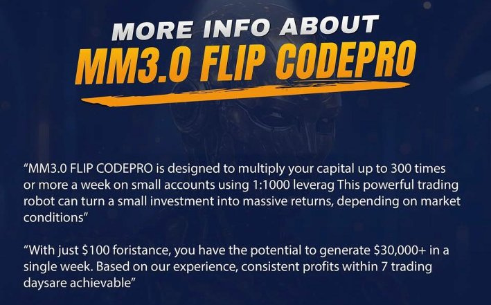 “MM 3.0 FLIP CODEPRO IS DESIGNED TO MULTIPLY YOUR CAPITAL UP TO 300 TIMES OR MORE A WEEK ON SMALL ACCOUNTS USING 1: UNLIMITED THIS POWERFUL TRADING ROBOT CAN TURN SMALL INVESTMENTS INTO MASSIVE RETURNS DEPENDING ON MARKET CONDITIONS”
