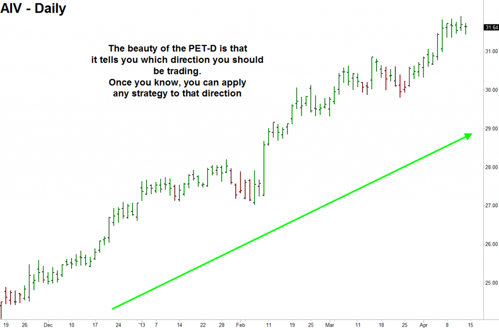 PET-D: The PET-D is literally a color bar “translator” that translates which direction the market wants to move by painting bars (Green=up / Red=down) on a tick-by-tick basis. This proprietary algorithm is a great edge for traders to have because the knowledge of the short-term trend is coming directly from the market you are trading and NOT from an outside source. One of the best applications of the PET-D is as a signal confirmation tool. Therefore, if your strategy generates a buy signal it should have a higher level of consistency if the signal bar is colored Green by the PET-D and Red for sells. Since the PET-D is NOT a strategy it does not generate its own individual signals, but it does produce dozens of techniques that highlight high-probability entry, exit, and stop placement points. The PET-D is a proprietary tool (formula is kept in house) that can be applied to any market, any time frame, and any direction.