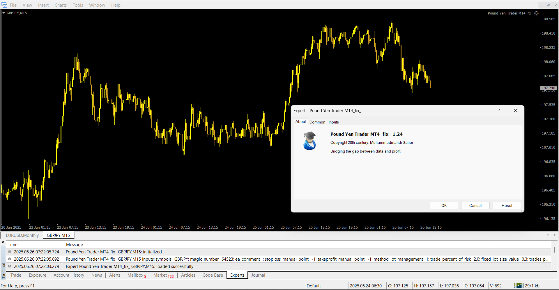 Pound Yen Trader is a smart trading robot made specifically for trading GBP/JPY on the 15-minute (M15) chart. Built using over 20 years of price data, this EA is trained to spot and take advantage of high-probability trading patterns unique to this currency pair.