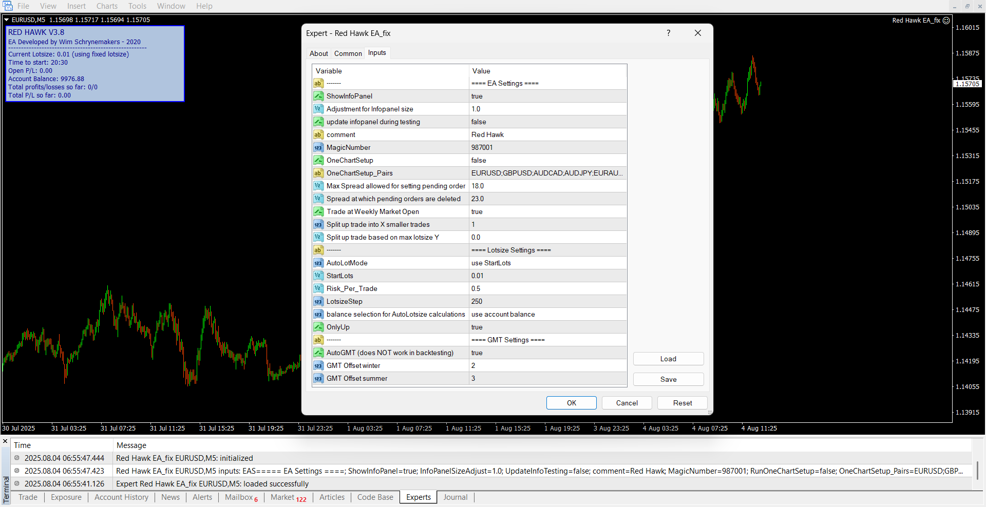 Attach Red Hawk EA to M5 chart for each of the 9 supported pairs
