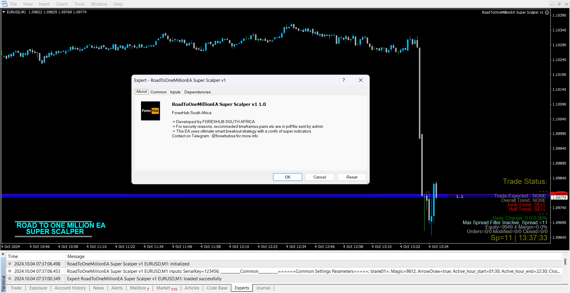 Content: Expert: RoadToOneMillionEA Super Scalper v1.ex4 (Unlocked-Unlimited), Libraries: ForexHubLib.ex4, Document: SerialKey, NO MANUAL.