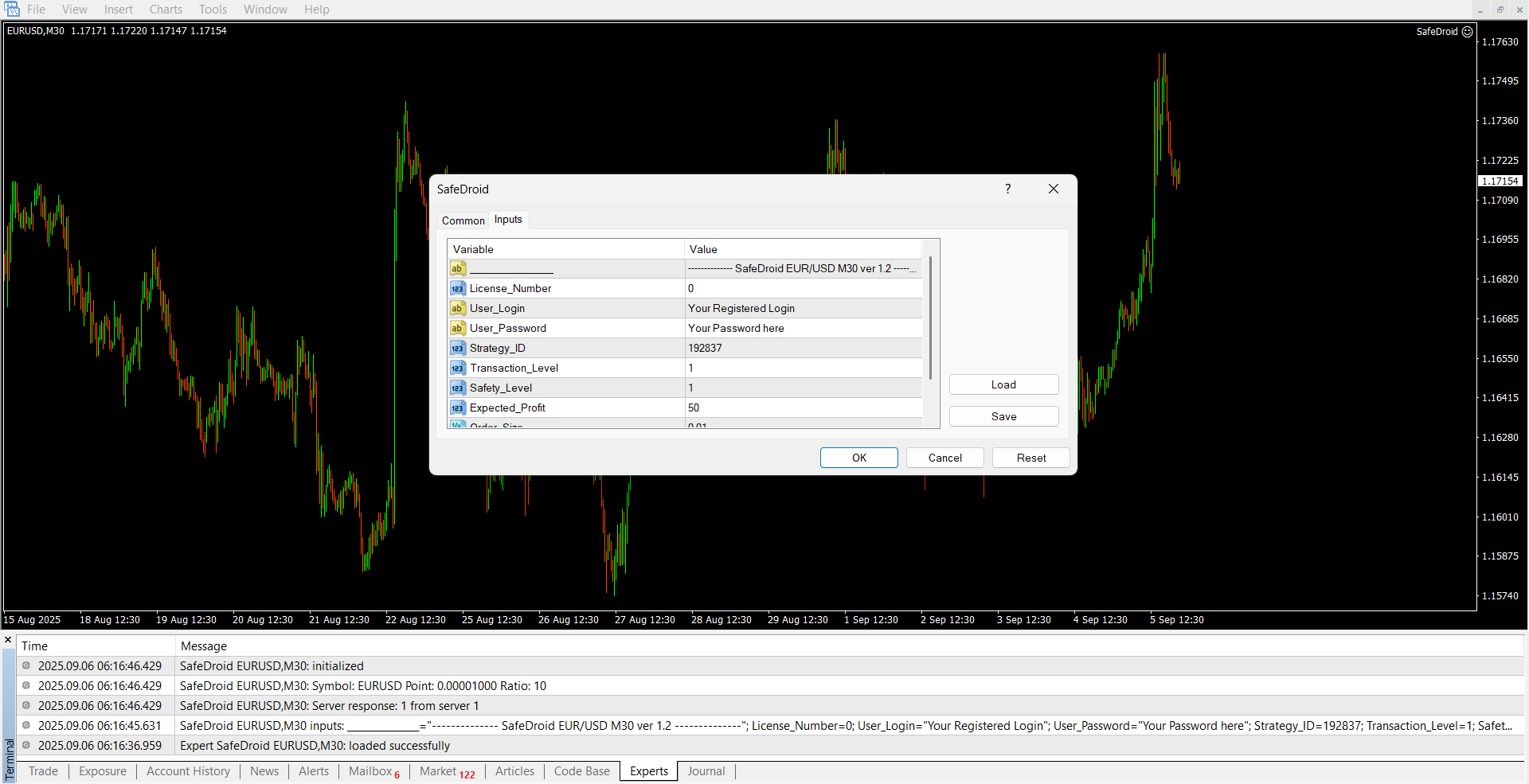 Content: Expert: SafeDroid.ex4 (Unlocked-Unlimited), Libraries: SafeDroid.dll, SafeDroid_edu.dll, SafeDroid_orig.dll, Preset: SafeDroid_EURUSD_M30.set, UserGuide: SafeDroid.pdf.