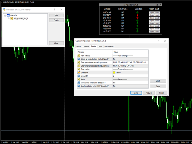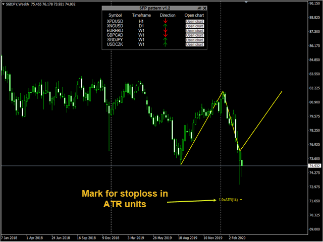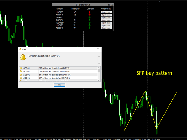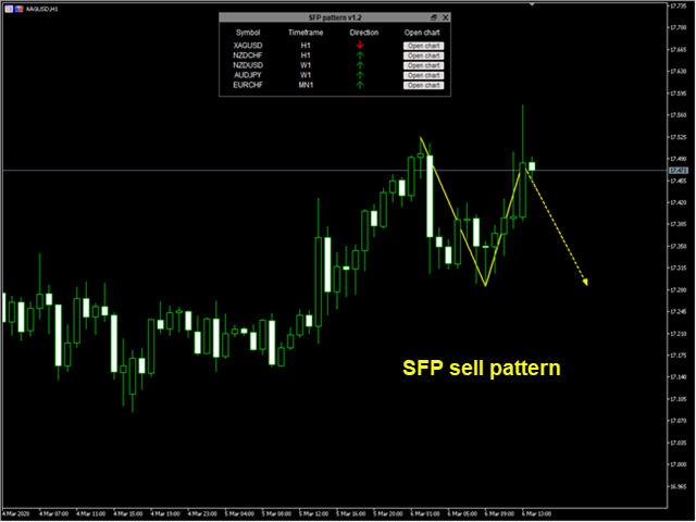 Indicator finds SFP patterns on selected symbols and time frames and depending on your choice alerts or sends an email. All information is shown in the dashboard. You can open selected chart from the table and see the drawn pattern.