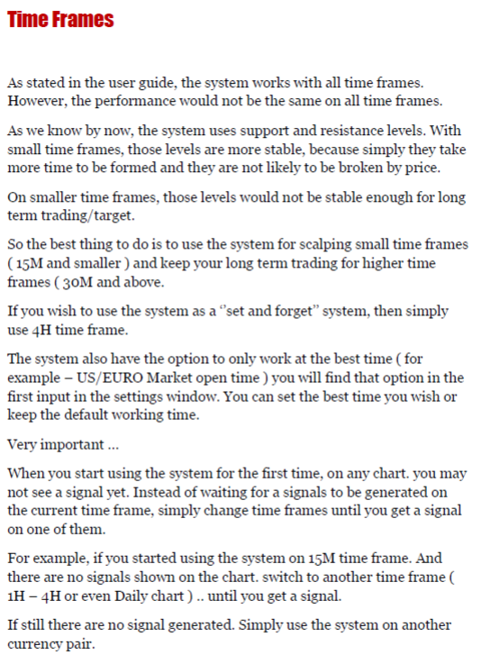 The system is intended to be user-friendly, with no need for advanced knowledge in forex trading. All the trader has to do is follow the signals generated by the software. These signals can be easily copied and pasted into any trading platform, not limited to MetaTrader, and can be used with any broker.