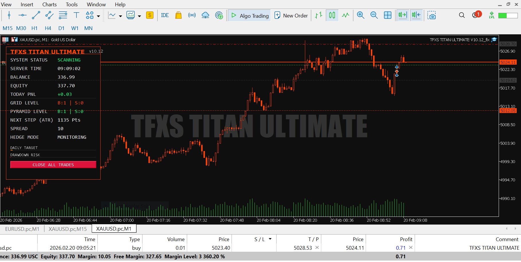 Content: Expert: TFXS TITAN ULTIMATE V10.12_fix.ex5 (Unlocked-Unlimited), Presets: TFXS high performance setfile (low risk edition).set, TFXS XAUUSD-500-1000$-M5-MEDIUM RISK-1.set, UserGuides: TFXS TITAN ULTIMATE V10.12 – OFFICIAL MANUAL.pdf., TFXS TITAN V10 INSTALLATION GUIDE (MT5) – EN.pdf.