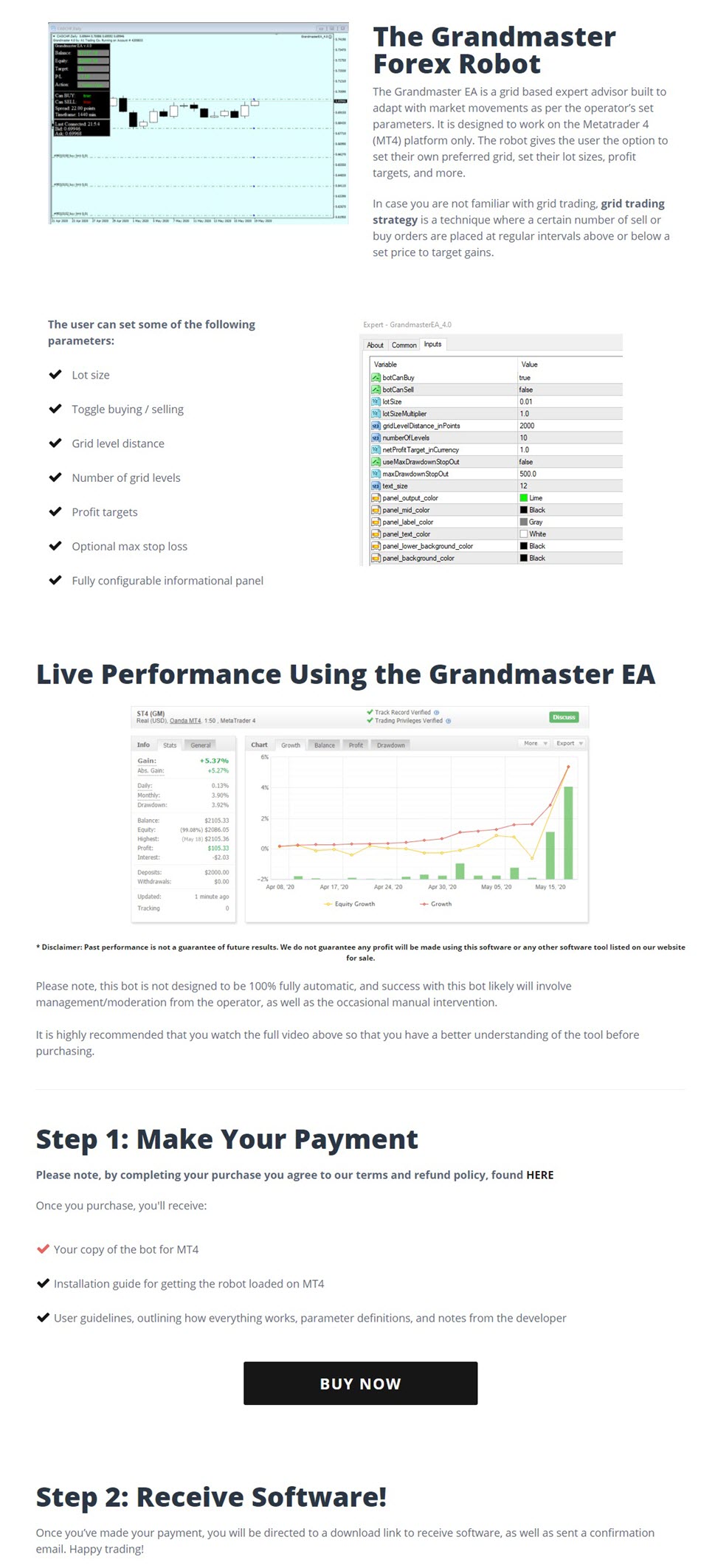 Content: Expert: GrandmasterEA_4.0.ex4 (Unlocked-Unlimited), Documents: Installation Guide.pdf, Grandmaster EA User Guide.pdf.