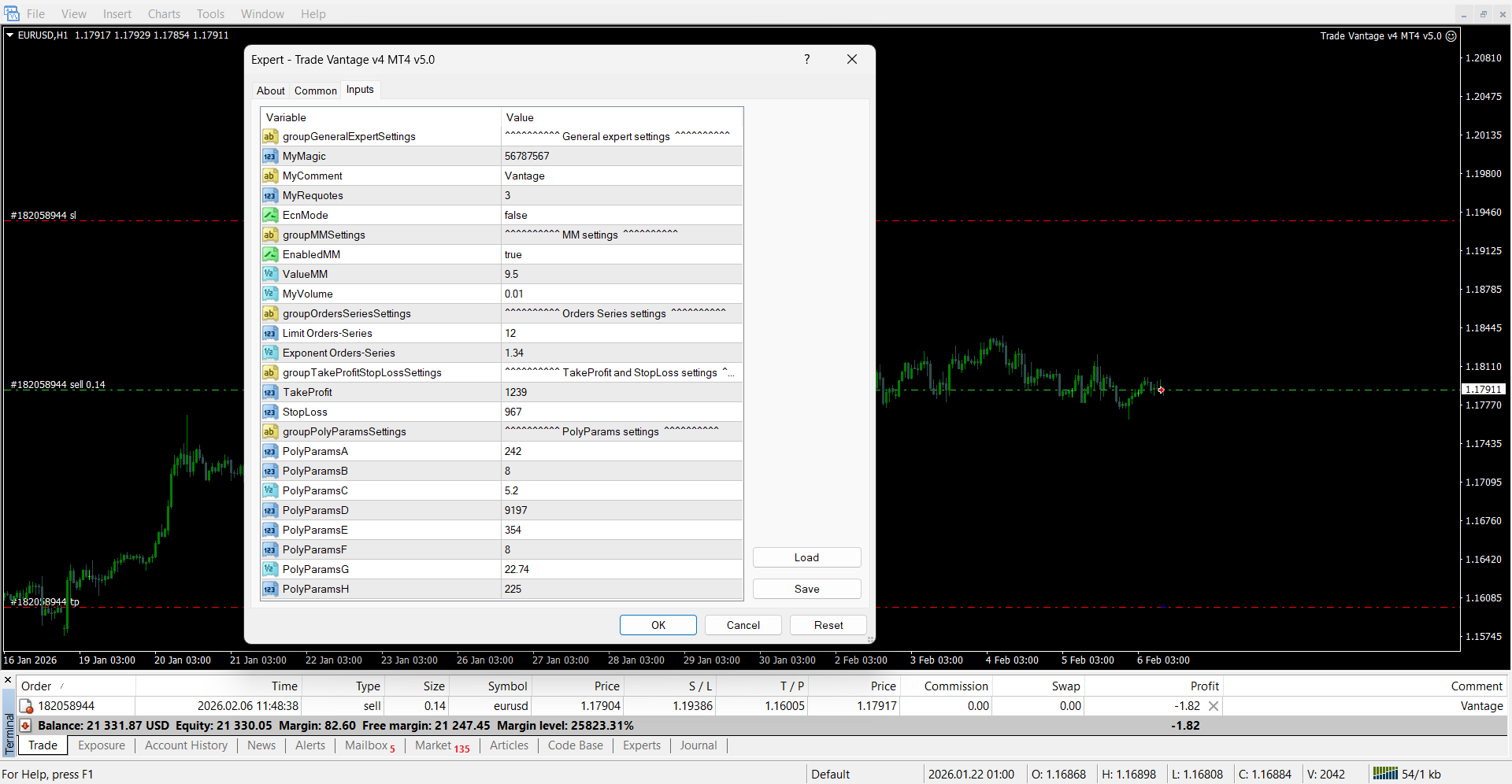 “^^^^^^^^^^ General expert settings ^^^^^^^^^^”MyMagic – Magic numberMyComment – Comments for ordersMyComment; // CommentOrdersMyRequotes – RequotesSetStopsLevel – Artificially set stop level and freeze levelEcnMode – Trading on ECN account (depending on account type)AsynchronousMode – Asynchronous trading (per broker requirement)TypeFilling – Type of order filling (per broker requirement)“^^^^^^^^^^ MM settings ^^^^^^^^^^”EnabledMM – Enable automatic risk calculationValueMM – * Volume calculation based on balance and other settingsMyVolume – Fixed volume trading“^^^^^^^^^^ Orders Series settings ^^^^^^^^^^”Limit Orders-Series – Series settingsExponent Orders-Series – Exponential calculation of order step in the series“^^^^^^^^^^ TakeProfit and StopLoss settings ^^^^^^^^^^”TakeProfit – TakeProfit settingsStopLoss – StopLoss settings“^^^^^^^^^^ PolyParams settings ^^^^^^^^^^”PolyParamsA – Characteristics of the signal system that is part of indicators and pattern recognition PolyParamsAPolyParamsB – Characteristics of the signal system that is part of indicators and pattern recognition PolyParamsBPolyParamsC – Characteristics of the signal system that is part of indicators and pattern recognition PolyParamsCPolyParamsD – Characteristics of the signal system that is part of indicators and pattern recognition PolyParamsDPolyParamsE – Characteristics of the signal system that is part of indicators and pattern recognition PolyParamsEPolyParamsF – Characteristics of the signal system that is part of indicators and pattern recognition PolyParamsFPolyParamsG – Characteristics of the signal system that is part of indicators and pattern recognition PolyParamsGPolyParamsH – Characteristics of the signal system that is part of indicators and pattern recognition PolyParamsH
