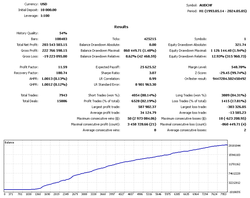 Multi-currency support: Works with various currency pairs on an hourly chart (H1) with a leverage of 1:100.