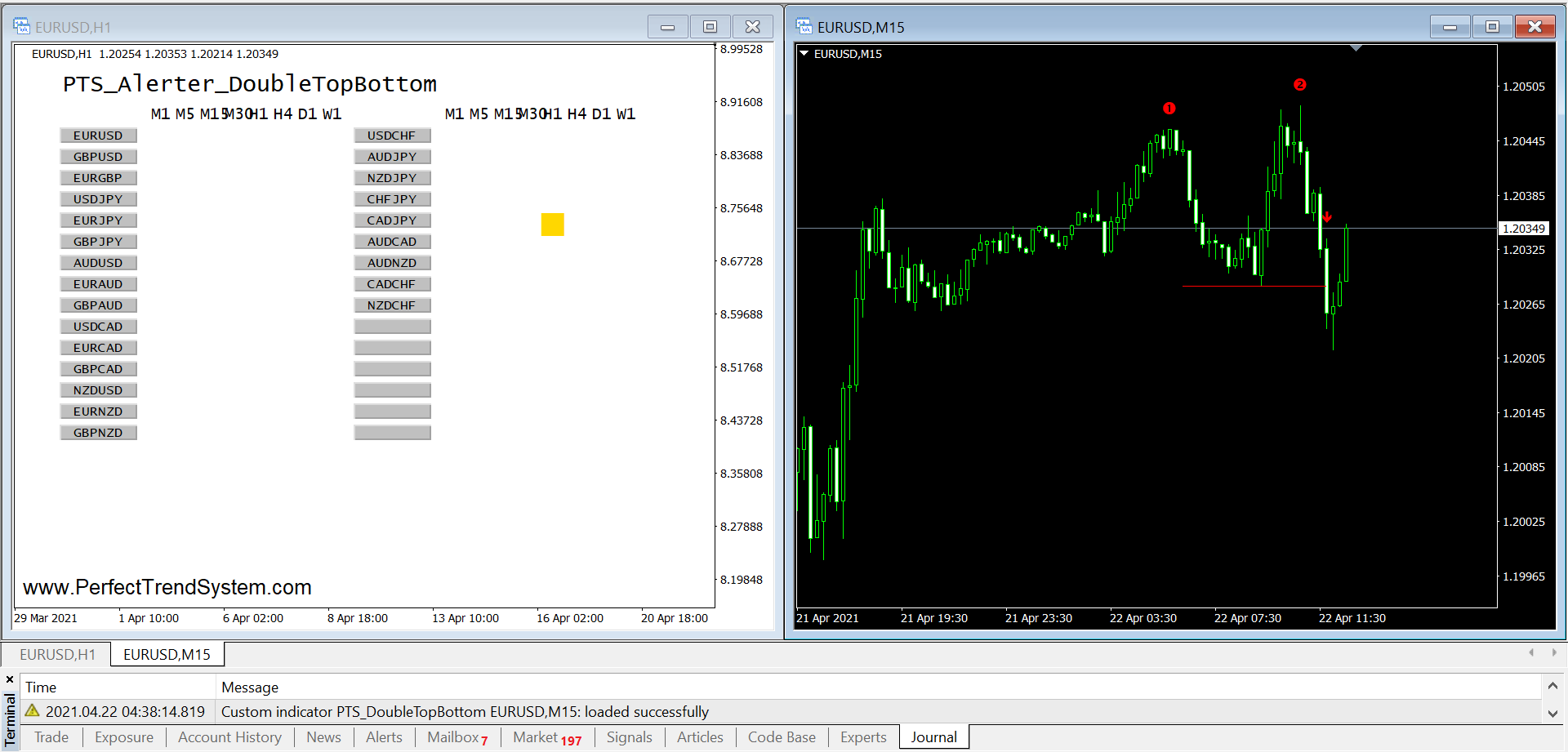 The Double Top/Bottom Alerter automatically scans up to 30 trading instruments across up to 8 timeframes to detect classic reversal setups: